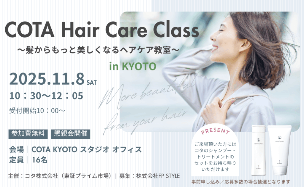 2025年11月8日に、女性のための特別ヘアケアイベント「COTA Hair Care Class 〜髪からもっと美しくなるヘアケア教室〜」を京都で開催します。